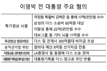 검찰에 따르면 이 전 대통령은 110억원대 불법자금 수수 혐의(특정범죄가중처벌법상 뇌물)와 348억원 규모의 다스(DAS) 비자금 횡령 혐의(특정경제범죄가중처벌법상 횡령) 등을 받고 있다.