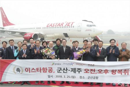 25일 전북도와 이스타항공은 군산공항에서 '군산-제주 오전, 오후 왕복 취항' 환영행사를 열고, 송하진 전북도지사는 직원들과 함께 '1일 생활권' 체험행사'에 나섰다.