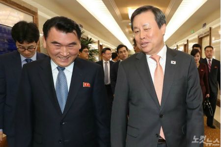 남북평화 협력기원 남측예술단을 인솔하는 도종환 문체부 장관이 31일 오후 평양순안국제공항에 도착, 박춘남 문화상(왼쪽)의 환영을 받고 있다. (사진=사진공동취재단)
