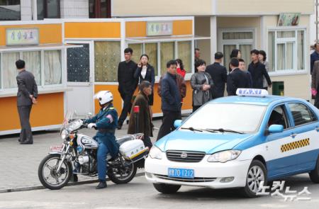 2일 오후 평양 창전거리에 교통경찰 오토바이와 택시가 대기해 있다. (평양공연 사진공동취재단)