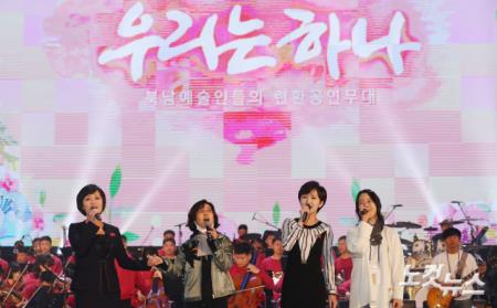 북한 삼지연관현악단 김옥주(왼쪽부터), 이선희와 백지영(오른쪽) 등이 3일 평양 류경정주영체육관에서 열린 남북합동공연 리허설에서 함께 노래하고 있다. (평양공연 사진공동취재단)