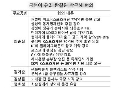 게다가 박 전 대통령은 ▲문화‧예술계 블랙리스트 ▲청와대 비밀문건 유출 등 혐의도 받고 있다. 공범인 김기춘‧조윤선‧정호성 등은 모두 유죄를 받았다.