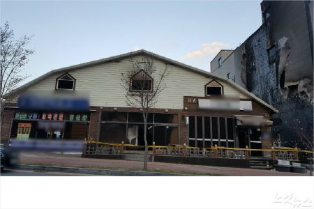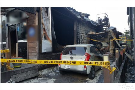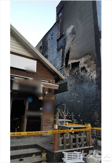 불이 난 조립식 건물 바로 옆 건물의 외벽도 심하게 그을리면서 당시의 참화가 심각했음을 보여줬다.