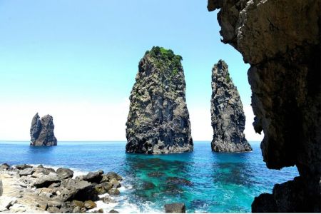 울릉도 3대 비경 중 하나로 꼽히는 삼선암. 천부리 앞바다에 우뚝 서있는 세 개의 기암으로 지상으로 놀러 온 세 선녀에 얽힌 전설이 내려온다. (사진=웹투어 제공)