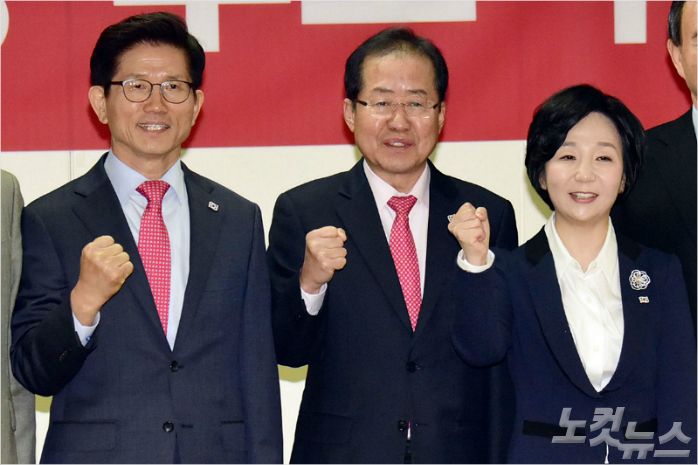 자유한국당 홍준표 대표가 10일 오전 여의도 당사에서 열린 서울·세종시장 후보 추대 결의식에 김문수 서울시장 후보, 송아영 세종시장 후보와 파이팅을 외치고 있다. 윤창원기자