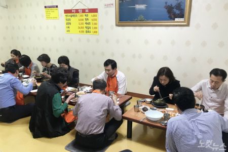 11일 지역경제 활성화의 날을 맞아 봉명동 호텔리베라 인근 한 식당에서 이원구 유성구청장 권한대행과 구청직원들이 점심식사를 하고 있다. (사진=유성구청 제공)