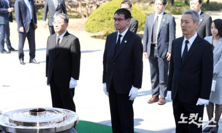 고노 다로 일본 외무상(가운데)이 11일 서울 동작구 국립현충원을 찾아 참배하고 있다.