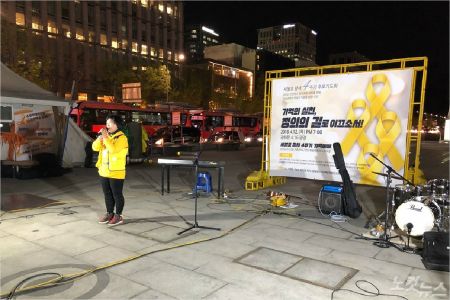 416 가족협의회 권미화 어머니가 현장 증언을 하고 있다. 세월호 가족은 진상규명이 이루어질 때까지 세월호를 잊지 말아달라고 당부했다.