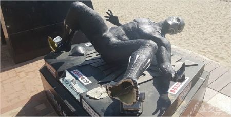 21일 부산 광안리해수욕장에 설치된 영화 블랙팬서 조형물이 파손된 채 발견됐다. 확인 결과 한 20대 여성이 술에 취해 사진을 찍다가 훼손한 것으로 드러났다. (사진=부산 수영구청 제공)