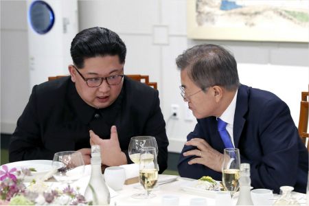 지난 27일 오후 문재인 대통령과 김정은 국무위원장이 평화의 집에서 열린 남북정상회담 만찬에서 대화를 나누고 있다. (사진=한국공동취재단/자료사진)