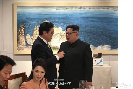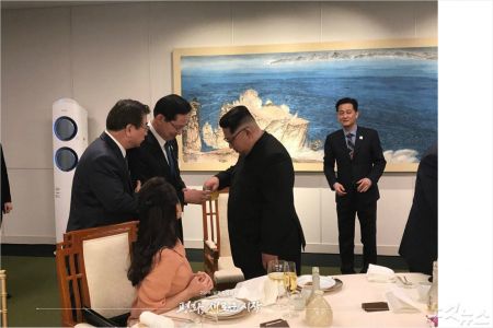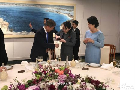 첨부한 사진에는 김여정 부부장이 문재인 대통령에게, 김정은 위원장이 우리측 송영무 국장장관에게 각각 술을 권하는 사진이 포함돼 있다.