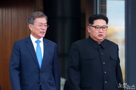 문재인 대통령과 김정은 국무위원장이 공동선언문 발표를 위해 지난 27일 경기도 파주 판문점 평화의집을 나오고 있다. (사진=한국공동사진기자단)