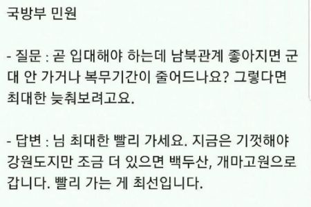 30일 소셜(SNS)미디어계정 한 이용자는 "이번 남북정상회담 후 올라왔다는 국방부 민원 답변의 센스. 이런 날이 빨리 오기를. 이게 실제 상황입니까"라는 글과 함께 사진 한장이 올라왔다.