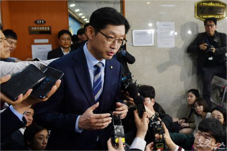 댓글 조작 사건 이른바 '드루킹 사건'에 연루됐다는 의혹을 받는 김경수 더불어민주당 의원이 지난 19일 오후 서울 여의도 국회 정론관에서 입장 발표 및 경남지사 출마 선언을 한 뒤 취재진 질문에 답변하고 있다. (사진=윤창원 기자)