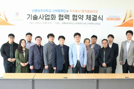 강릉원주대학교 산학협력단(단장 하태권)과 (주)엔지엠바이오(대표 주성수)가 3일 '기술사업화 협력' 업무협약을 체결했다