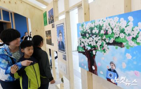 4일 오후 서울 종로구 청와대 사랑채에서 열린 '다시 봄, 문재인 정부 취임 1주년 기록 사진전'을 찾은 시민들이 사진을 관람하고 있다.