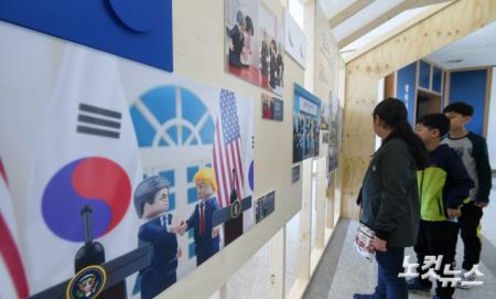 4일 오후 서울 종로구 청와대 사랑채에서 열린 '다시 봄, 문재인 정부 취임 1주년 기록 사진전'을 찾은 시민들이 사진을 관람하고 있다.