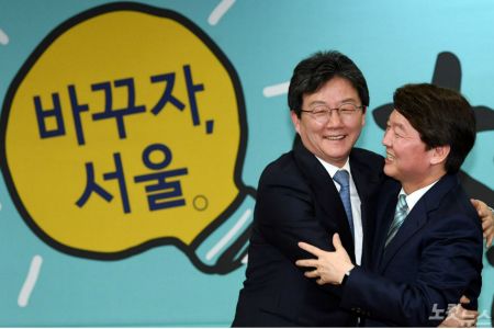 바른미래당 안철수 서울시장 예비후보가 지난 8일 오후 서울 종로구 동일빌딩에서 선거사무소 개소식을 갖고 유승민 공동대표와 포옹하고 있다. (사진=황진환 기자/자료사진)
