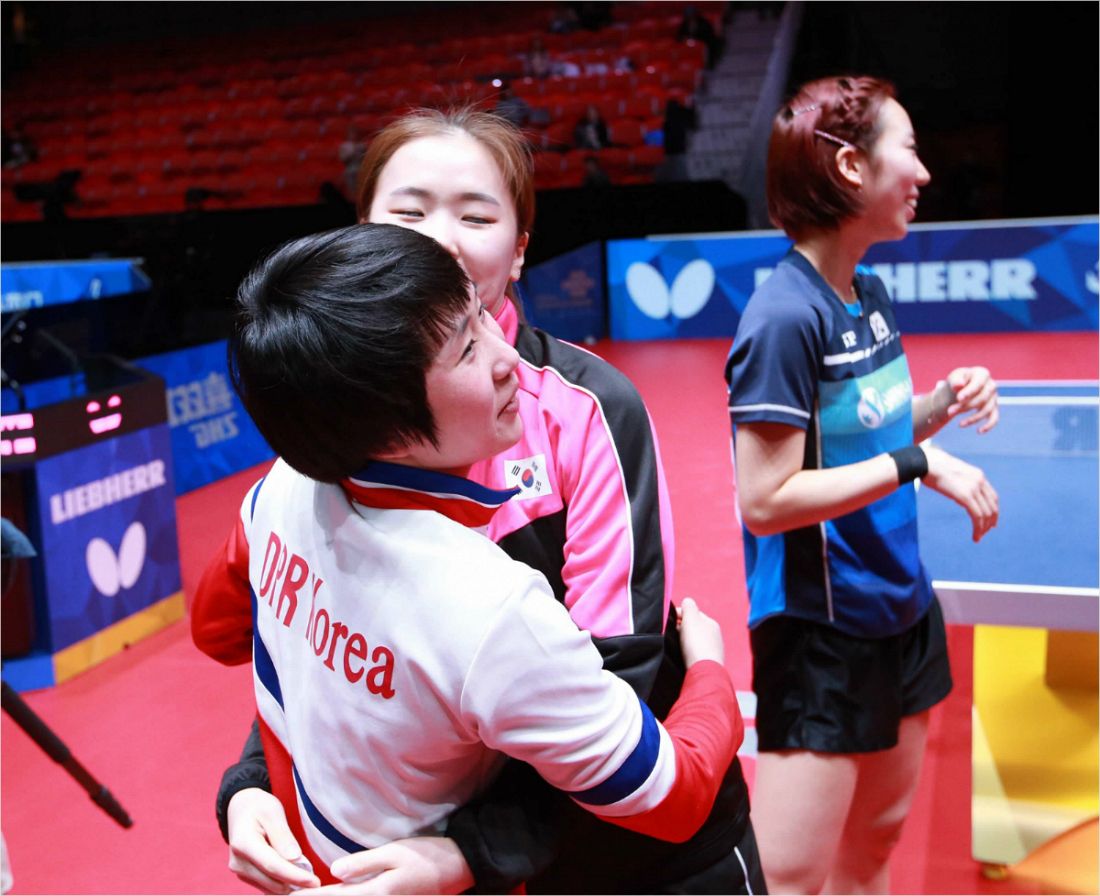 일본과 세계선수권 4강전을 마친 뒤 서로 끌어안으며 석별의 정을 나누고 있는 남북한 여자 대표팀 선수들.(스웨덴=대한탁구협회)