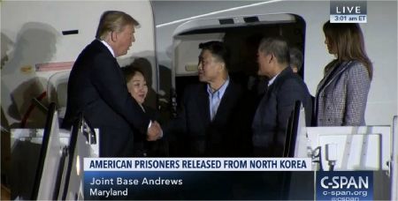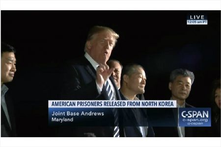 3명의 억류자들을 만난 뒤 함께 항공기 트랩을 내려온 트럼프 대통령은 대기하고 있던 기자들에게 "특별한 밤"이며 "이들이 풀려난 것은 매우 중요하다"고 의미를 부여했다.