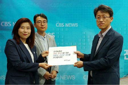 전북민주언론시민연합 손주화 사무국장과 전북언론노조협의회 고차원 협의회장이 11일 전북CBS를 방문해 김용완 보도제작국장에게 선거 토론회 관련 제안서를 전달하고 있다. (사진=2018 전북 지방선거 미디어감시연대 제공)