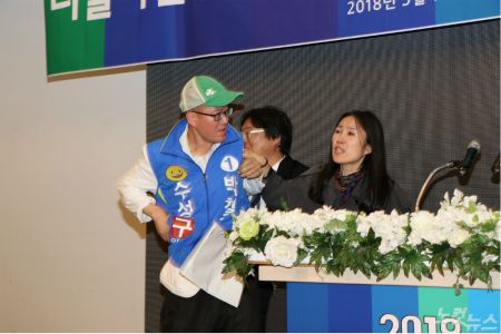 더불어민주당 대구시당 지방선거 필승 전진대회 중 공천 탈락자들이 단상위로 올라와 항의하고 있다.