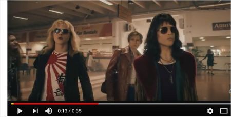 지난 14일(한국시간) 유튜브에 공개된 록그룹 '퀸' 전기영화 '보헤미안 랩소디' 예고편 티저영상 중 12초 무렵에 퀸 멤버 가운데 한 명이 욱일기 무늬 티셔츠를 입은 장면이 나온다. 사진=유튜브 영상 캡처