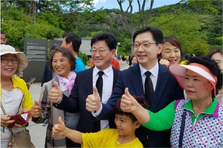 김경수 더불어민주당 경남지사 후보와, 김 후보의 사퇴로 치러지는 김해시 을 선거구 국회의원 보궐선거 민주당 후보인 김정호 영농업인 봉하마을 대표가 노 전 대통령 서거 9주기 추도식에서 만나 지지자들과 포즈를 취하고 있다. (경남CBS 이상현 기자)