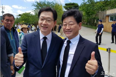 김경수 더불어민주당 경남지사 후보와, 김 후보의 사퇴로 치러지는 김해시 을 선거구 국회의원 보궐선거 민주당 후보인 김정호 영농업인 봉하마을 대표가 노 전 대통령 서거 9주기 추도식에서 만나 포즈를 취하고 있다. (사진=이상현 기자)