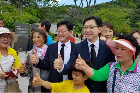 김경수 더불어민주당 경남지사 예비후보가 23일 노무현 전 대통령 9주기 추도식에 참석해 지지자들과 사진을 찍고 있다. (경남CBS 이형탁 기자)