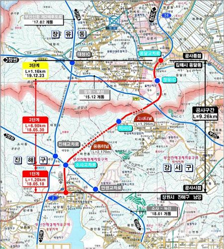 이번에 부분 개통하는 구간은 지난 18일 개통한 창원시 진해구 남양동~소사동(소사교차로) 1.2km구간과 연계한 6.9km 구간으로 김해율하2지구 택지개발사업 내 도시계획도로 완공에 맞춰 2단계로 개통하는 자동차전용도로 구간이다.