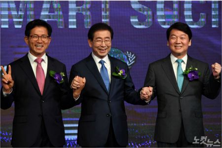 30일 오전 서울 중구 더플라자 호텔에서 열린 한국미래포럼 KFF에서 자유한국당 김문수 서울시장후보, 더불어민주당 박원순 서울시장 후보, 바른미래당 안철수 서울시장 후보(왼쪽부터)가 기념촬영을 하고 있다. 이한형기자