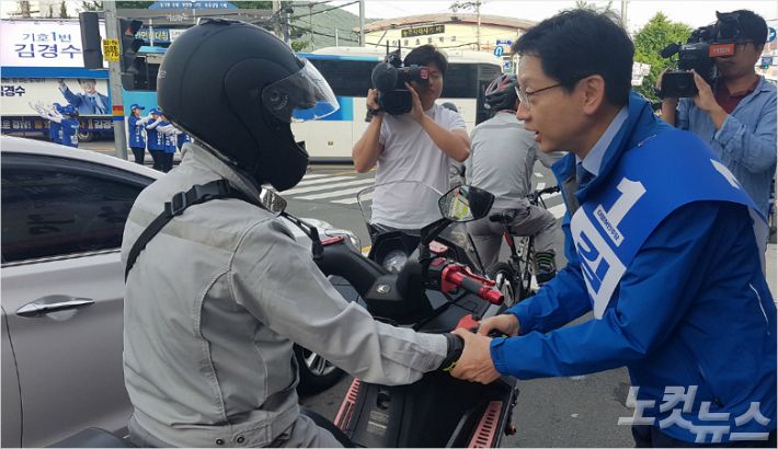 김 후보는 유세 차량에 올라 "경남에서 가장 아픈 곳인 거제에서 첫 선거 운동을 시작하고 있다"며 "거제를 살려야 경남이 살아난다. 문재인 대통령과 저 김경수, 변광용 거제시장 후보인 원팀이 경제를 반드시 살리겠다"고 강조했다.