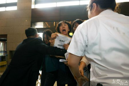 KTX 해고승무원들과 시민단체 회원들이 29일 오전 서울 서초구 대법원 앞에서 양승태 전 대법원장 구속수사와 김명수 대법원장 면담 요청하며 대법원 진입을 시도하고 있다. (사진=이한형 기자)