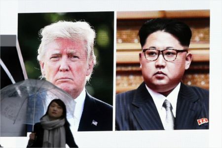 도쿄에서 한 여성이 트럼프 미국 대통령과 북한 김정은의 얼굴을 띄운 대형 스크린 앞을 지나는 모습 (사진=연합뉴스 제공)