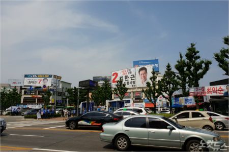 7일 오후 취재진이 찾은 강원 강릉시의 옥천오거리는 이번 지선에 출마한 후보들의 현수막 13장으로 에워싸여 있었다.