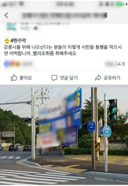 앞서 지난 6일 강릉지역의 한 인터넷 커뮤니티에는 강릉 경포오거리 횡단보도에 후보들의 현수막이 버젓이 걸려 보행자들이 불편함을 겪고 있다는 글이 올라오기도 했다. 현재 해당 후보의 현수막은 철거된 상황이다.