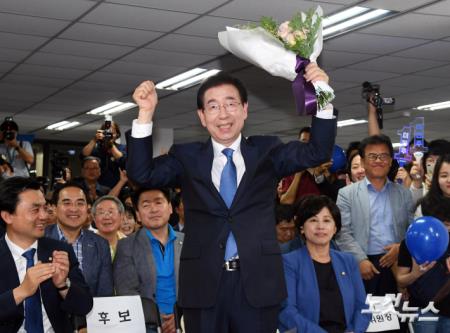 6.13지방선거 서울시장 선거에서 당선이 유력해지며 3선을 앞둔 더불어민주당 박원순 후보가 13일 오후 서울 안국동 선거캠프에서 꽃다발을 받고 손을 들어보이고 있다.