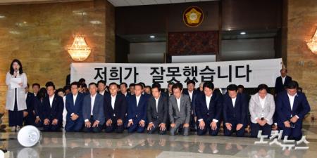 자유한국당 김성태 원내대표 겸 대표권한대행과 의원들이 15일 오후 국회 예결회의장에서 6·13 전국동시지방선거 패배와 관련 비상의원총회를 가진 뒤 나와 무릎을 꿇고 사과문을 발표하고 있다.