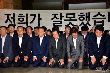 자유한국당 김성태 원내대표 겸 대표권한대행과 의원들이 15일 오후 국회 예결회의장에서 6·13 전국동시지방선거 패배와 관련 비상의원총회를 가진 뒤 나와 무릎을 꿇고 사과문을 발표하고 있다. (사진=윤창원 기자)