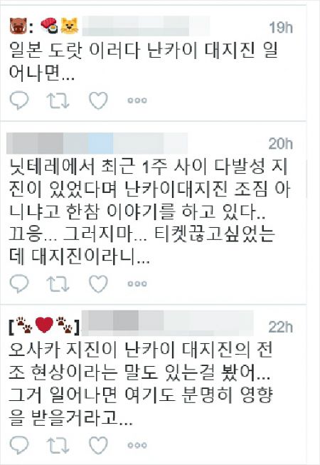 18일 오사카 지진 이후 SNS에는 난카이 대지진 발생을 우려하는 글이 올라와 있다. 사진=트위터 캡처