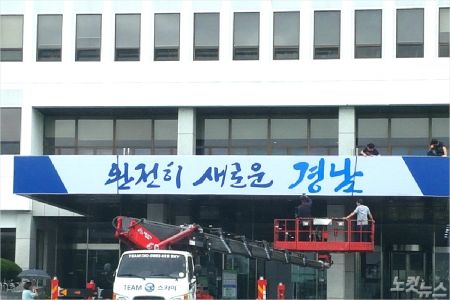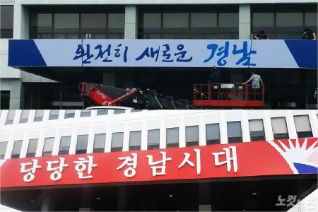 도는 민선 6기가 끝난 만큼 기존 현판에 있는 '당당한 경남시대'를 떼어 내고 그 자리에 임시로 '완전히 새로운 경남'을 붙였다.