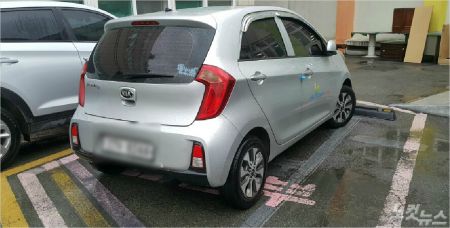 지난 6월 27일 , 분홍색 페인트로 구획선이 표시된 부산 북구 임산부 전용 주차구역에 구청 업무용 차량이 버젓이 주차돼 있는 모습<사진=부산cbs 강민정 기자>