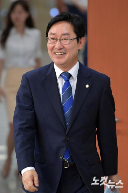 더불어민주당 박범계 의원이 4일 오전 국회 정론관에서 차기 당 대표 출마선언을 위해 단상으로 이동하고 있다.