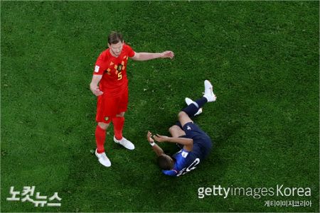 벨기에 수비수 얀 베르통언이 넘어진 프랑스 공격수 킬리안 음바페를 보면서 아쉬워하고 있다. (사진=노컷뉴스/gettyimages)