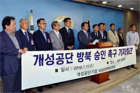 개성공단기업 비상대책위원회는 11일 국회 정론관에서 기자회견을 갖고 기업인들이 개성공단 중단 이후 시설점검을 위한 방북을 신청했지만 모두 성사되지 않았다며 시설점검은 국제사회 제재와 무관하기 때문에 방북을 승인해달라고 요구했다.