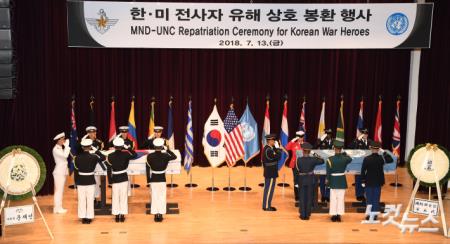 13일 오전 국립현충원에서 열린 한.미 6.25 전사자 유해 상호봉환 행사에서 하와이를 경유해 한국으로 들어온 미1기병단 소속 고 윤경혁 일병의 유해와 미국으로 가는 신원 미확인의 미군유해가 운구되고 있다. (사진공동취재단)
