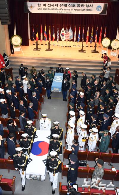 13일 오전 국립현충원에서 열린 한.미 6.25 전사자 유해 상호봉환 행사에서 하와이를 경유해 한국으로 들어온 미1기병단 소속 고 윤경혁 일병의 유해와 미국으로 가는 신원 미확인의 미군유해가 운구 되고 있다. (사진공동취재단)