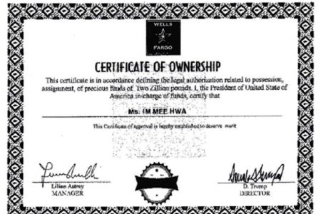 사진설명: 국제사기단 일당이 사용한 '트럼프 대통령 명의 인증서' 사본 (사진=서울중앙지검 제공)