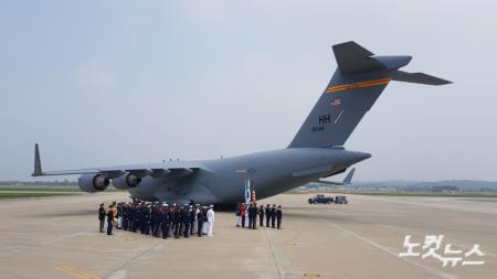 미군 유해 실은 수송기 오산 美 공군기지 도착